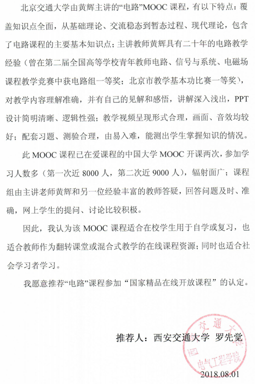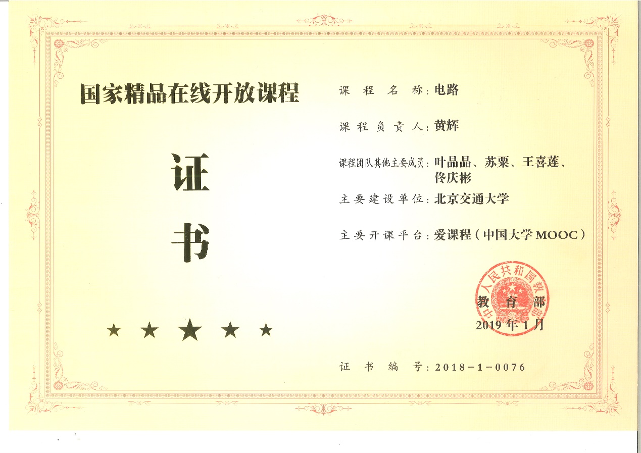 电路课程在2018年被评选为“国家精品在线开放课程”,2020年评为首批国家级线上一流课程。