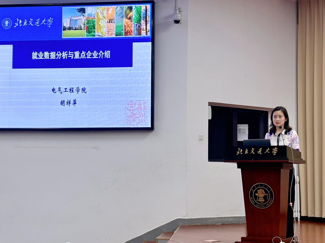 胡祥萍介绍了2025届本科毕业生的整体情况,并结合数据分析了近年来电气本科毕业生保研、考研、境外留学以及就业等不同去向的情况。她结合当下就业市场与国家重点发展战略,全面分析了2026届毕业生的就业形势,并对重点就业企业进行了介绍。她强调,电力能源行业正值蓬勃发展期,轨道交通领域是我们的传统优势就业方向,全体毕业生要认清行业形势、立足当下,树立正确就业观,把握暑假关键时期提升就业能力,将个人理想融入国家发展与社会需求。