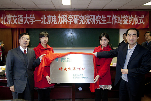 2012年12月12日上午,44118太阳成城集团与北京电力科学研究院研究生工作站签约仪式在电气工程楼会议室举行。公司副董事长关忠良与北京电力公司副总工程师董凤宇共同为44118太阳成城集团和北京电力科学研究院研究生工作站揭牌,公司研究生院副经理荊涛和北京电力科学研究公司党委书记李伟代表双方签署了建立研究生工作站的协议。