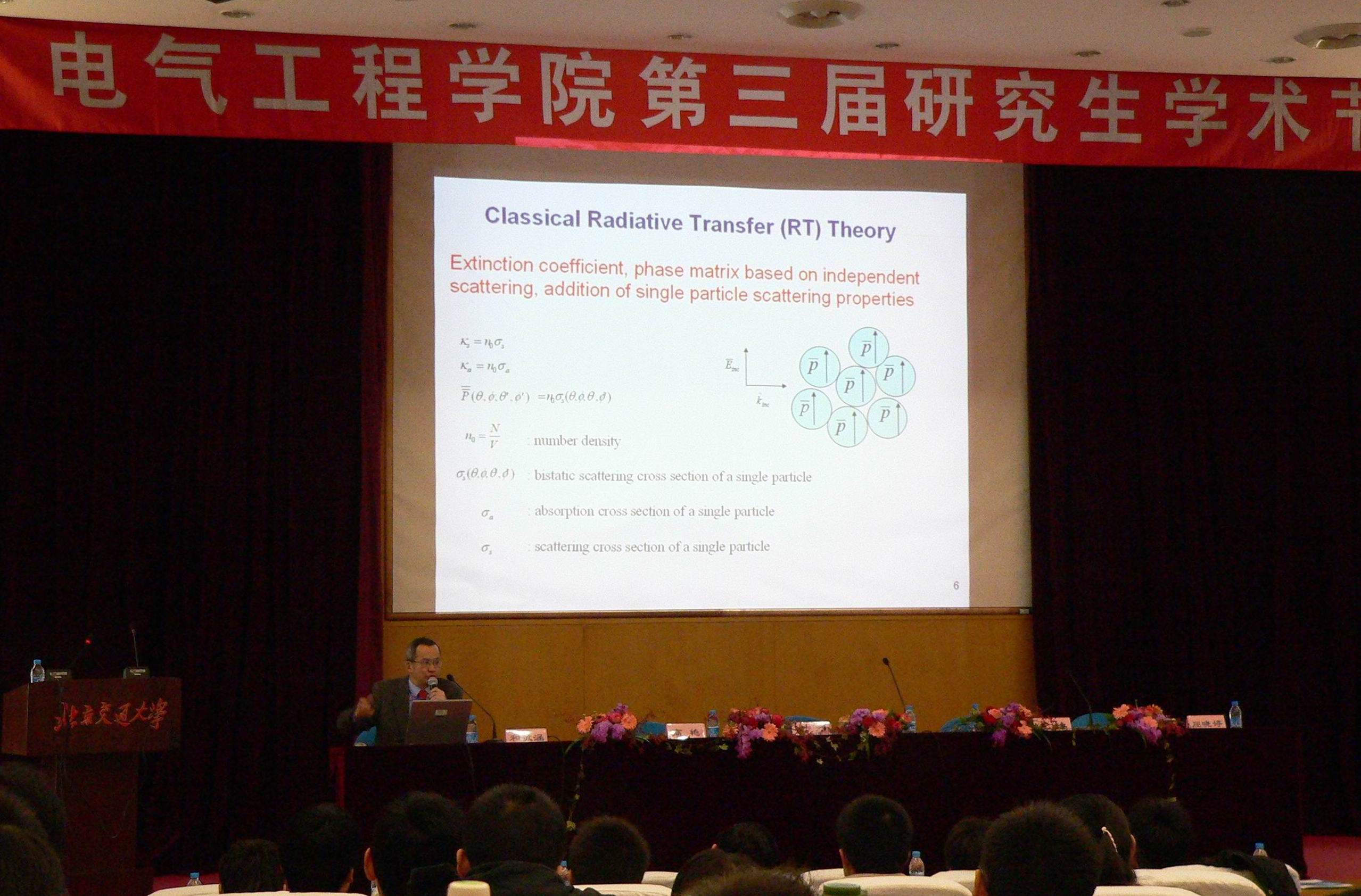 开幕式后,由今年国际电磁场会议“PIERS2009”主席曾亮教授做本届学术节首题为“Electromagnetic Waves Propagation and Scattering in Microwave Remote Sensing and Signal Integrity in Interconnects”的学术讲座,讲座涉及当今国际电磁场领域诸多前沿问题,就任意介质中的波散射与传播,高频互联技术和计算电磁学等高端研究领域做了细致讲解,并全程用英文与师生进行交流沟通,现场气氛热烈。报告结束后,曾教授还耐心地回答了同学和老师的提问,包括科研,教育等方面。曾教授报告涉及领域之宽,范围之广,开拓了每一位参加会议的研究生的视野,激发了研究生的科研热情和创新意识。