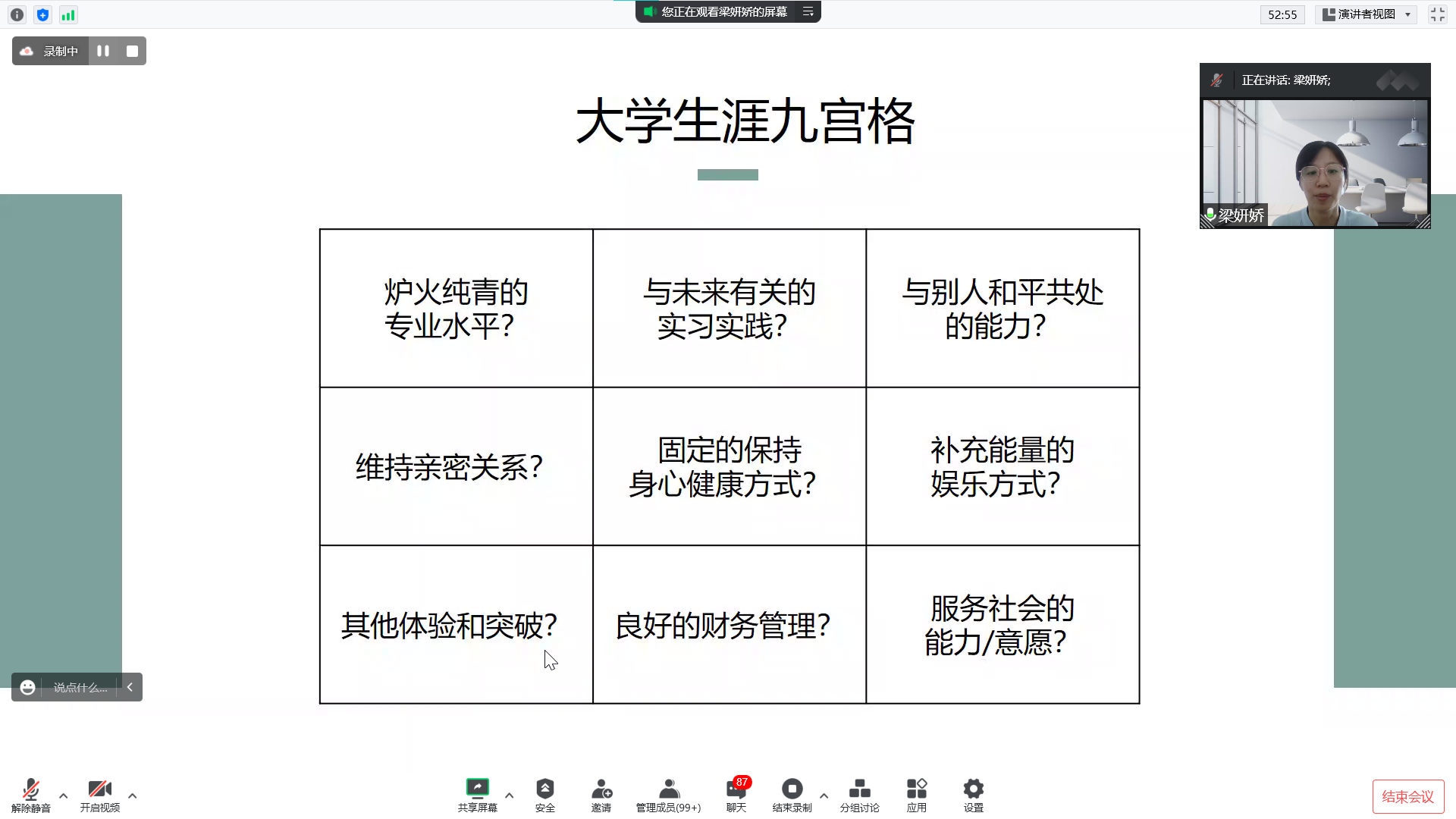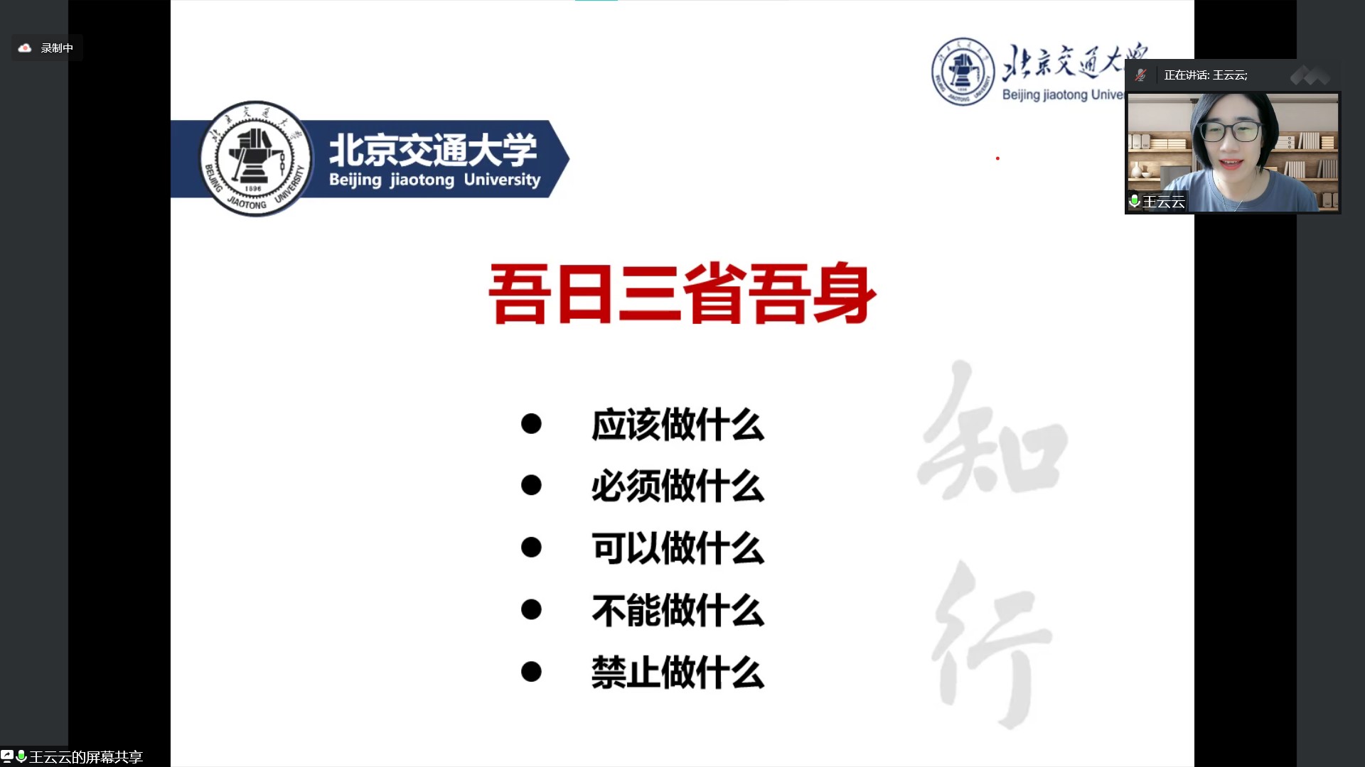 活动设置了“我的学习计划”“我的身心健康”“我的成长之路”“ 我的行为管理”“ 我的目标榜样”五个专题,分别由电气学院副经理王喜莲、教学科杨静雯和王翌,学校员工心理素质教育中心副主任张驰,学校就业与创业指导中心梁妍娇,员工资助管理中心王云云,电气学院19级本科生、国家奖学金获得者冉子艺讲授分享。