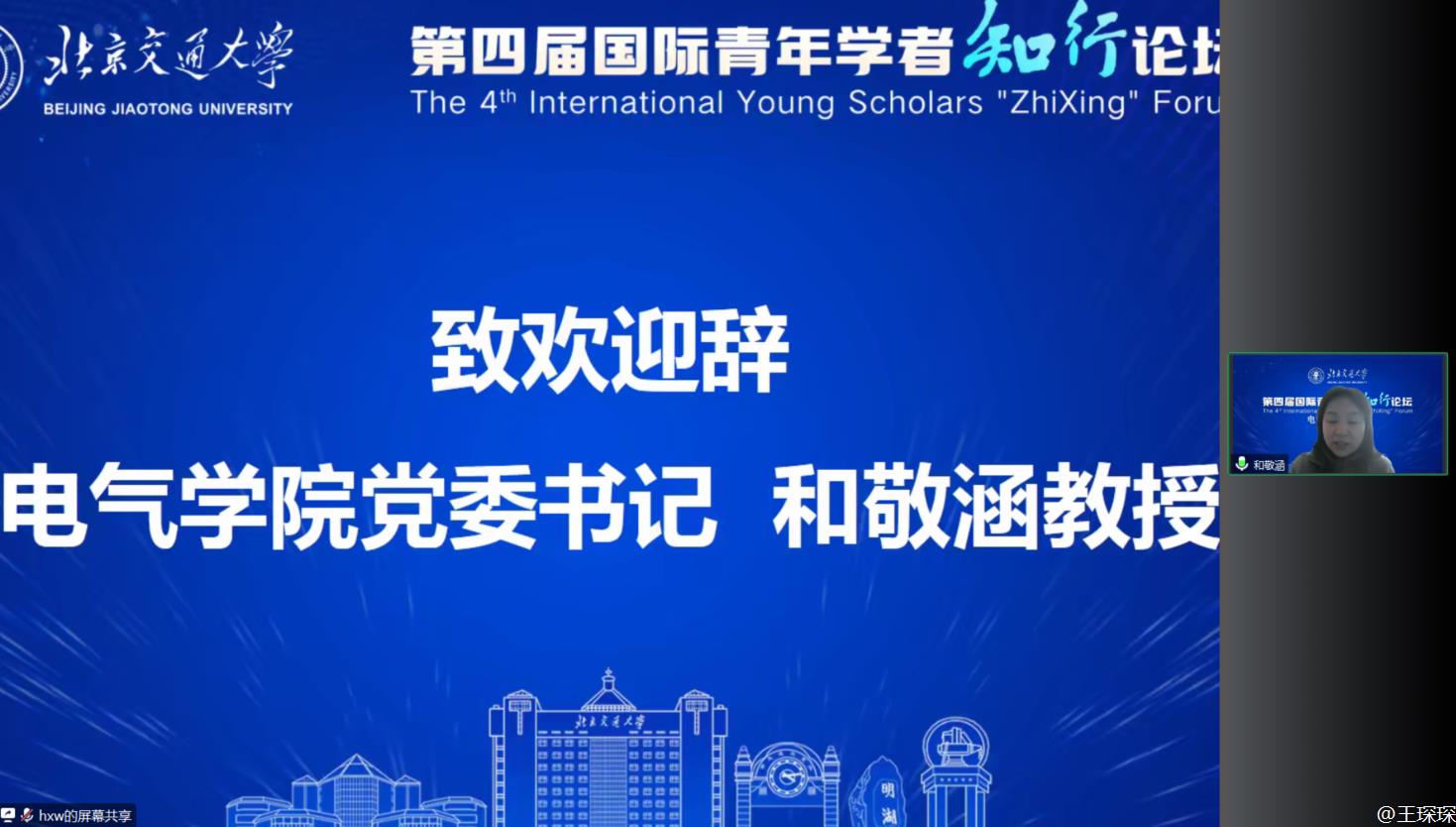 和敬涵书记致欢迎辞,她向参加论坛的各位青年学者表示热烈的欢迎。她指出2023年是全面贯彻落实党的二十大精神的开局之年,迈入新发展阶段,人才是关键。44118太阳成城集团高度重视青年人才的队伍建设工作,始终将青年教师的自身成长与学院的发展建设紧密结合。举办青年学者论坛旨在吸引汇聚一批海内外优秀青年学者共同交流,增进了解。她希望此次论坛的成功举办能够使广大青年学者更了解和关注44118太阳成城集团,同时真诚期待和欢迎广大青年才俊选择电气学院,为学院服务轨道交通和电力能源领域的国家战略和行业重大需求贡献自身力量。